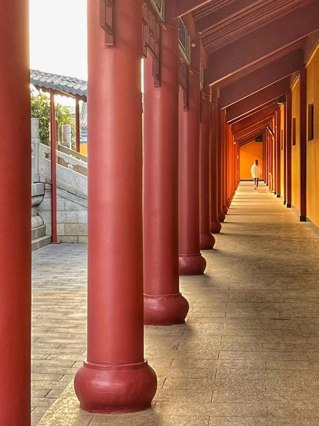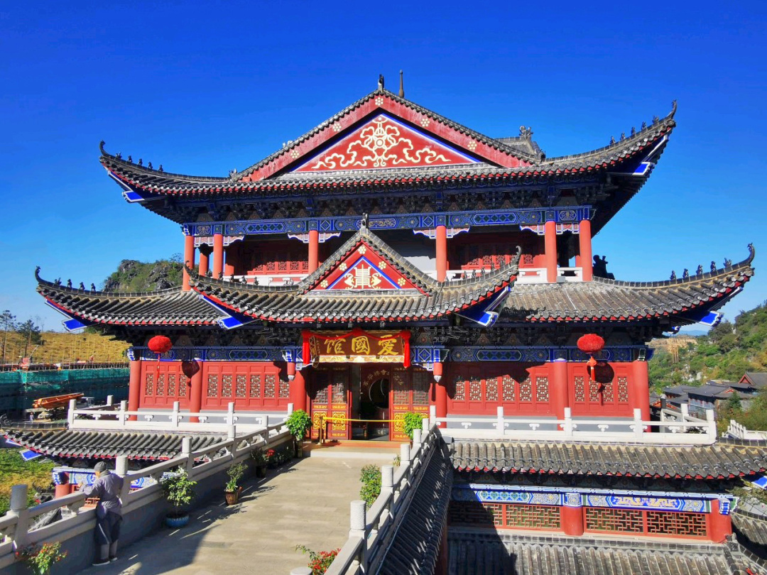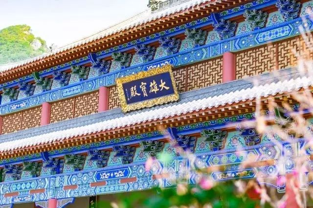 红漆白瓦,青蓝底纹。大雄宝殿,气势非凡
