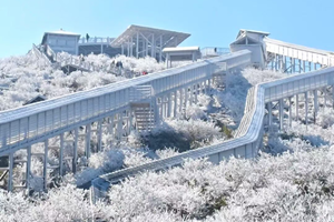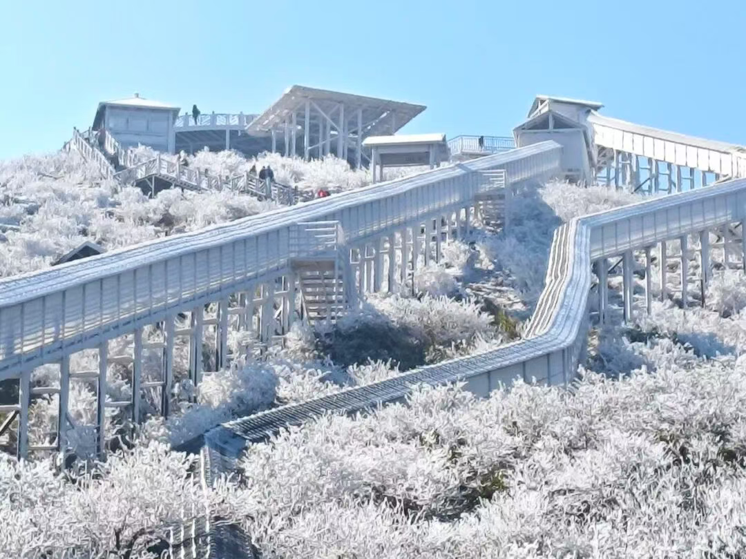 每逢冬季,整个山间晶莹剔透,露珠在低温下迅速凝结成冰,在风力的作用下,漫山遍野的植被被晶莹剔透的冰挂包裹,山顶、栈道、栏杆上也覆盖着厚厚的白霜。