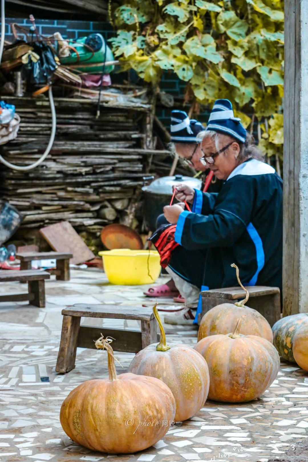 15:00左右油岭瑶寨徒步,由于油岭瑶寨尚未开发,比较原生态,路比较窄小,大巴不能开进去,需要徒步半个小时左右到寨里,然后开始摄影拍照(山下瑶寨房屋多是青砖木瓦、底层用石头砌成,木桩加固支撑顶层。二层外面,木头和栅栏围起来一个小院,摆上石桌石凳,闲来聊天。寨子内石板巷道纵横交错,将家家户户连接起来。