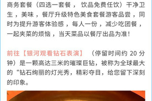 前往【银河观看钻石表演】 (停留时间约 20 分钟)是一颗高达三米的璀璨巨钻,被称为全球最大的“钻石绚丽的灯光秀,精彩夺目,给您留下深刻的印象。